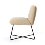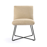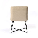 Low-styled sophistication. A slim X base of black iron supports invitingly textured seating of stain-resistant performance fabric in a neutral oatmeal.