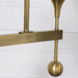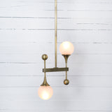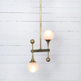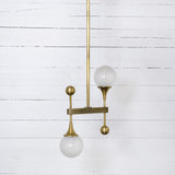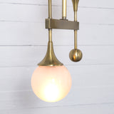This mid-century-inspired style hits all the right notes. A set of brass-finished steel forms trumpet-like shapes in reverse directions. Frosted-glass globes radiate warm, shapely vibes.