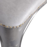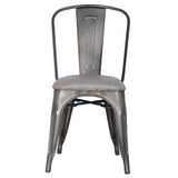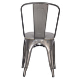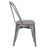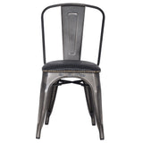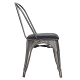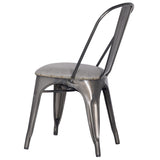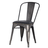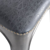 Metro chair is a solidly built steel chair with a little cush for the tush. The padded seat and antique brass upholstery nails separates this chair from the pack. A flexible style, this chair looks great with industrial, rustic and modern styles. It features rubber feet to protect your floors and a raw, gunmetal finish.