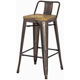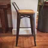 Metro stool - solidly built steel stool with an pine wood seat and low profile back. The solid pine wood seat is finished in a deep amber wash to compliment the look. The Metro stool looks great with industrial, rustic and modern styles. It features rubber feet to protect your floors and a raw, gunmetal or black finish. This stool comes in both counter and bar heights.