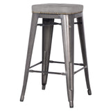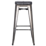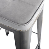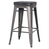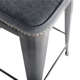 Metro stool - solidly built steel stool with an upholstered seat. This stool is available in two fabric colors - Vintage Black and Vintage Gray and two sizes, counter and bar height. The upholstery seat and antique brass upholstery nails separates this stool from the pack and looks great with industrial, rustic and modern styles. It features rubber feet to protect your floors and a raw, gunmetal finish.