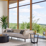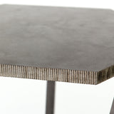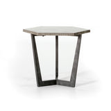 Cutting-edge style. A slim, mottled iron base meets a hexagon-shaped bluestone top for a geometric look inspired by Brutalist architecture. A raw, rustic vibe adds weight to an open-air frame.