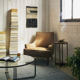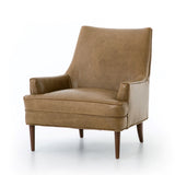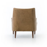 Mid-century shaping offers comfortably molded curves to the wing chair. Handpicked hides and hand-staining techniques celebrate the natural hallmarks of nature. Soft, buttery top-grain leather in rich camel pairs with classically tapered parawood legs.