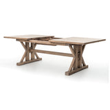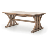 A simple, Italian farmhouse table adds architectural interest to traditional criss-cross supports. Finished in warm, sun-dried wheat tones to highlight natural wood grains.Tasteful distressing should be expected and enjoyed.