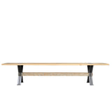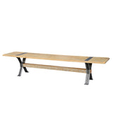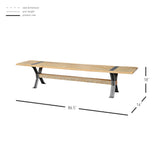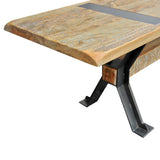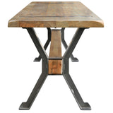 Modern Industrial farmhouse dining bench, featuring rustic indigo stained wood finish, metal inlays bolstered on modern X shaped iron legs.
